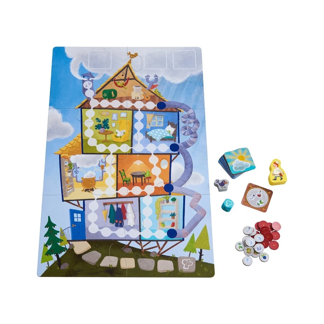 S’ils y parviennent avant que le marmiton ne rentre, ils gagnent la partie tous ensemble ! Assemblez le plateau de jeu, répartissez les tuiles « ingrédients » faces cachées et placez trois cartes « recettes » faces chaudrons visibles. Posez la corneille sur la case « cheminée » et le marmiton de la météo sur la case avec la toque de cuisinier.