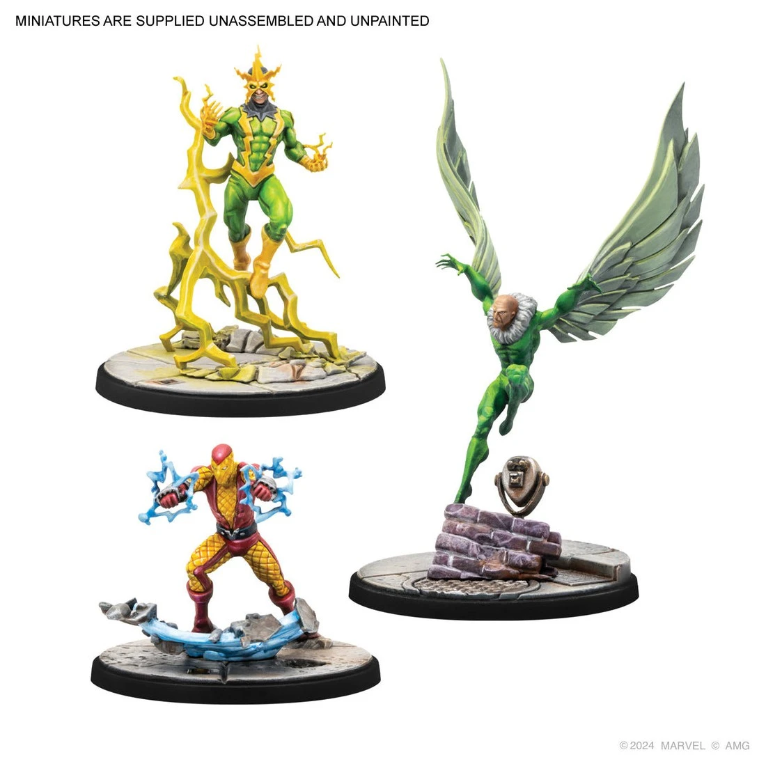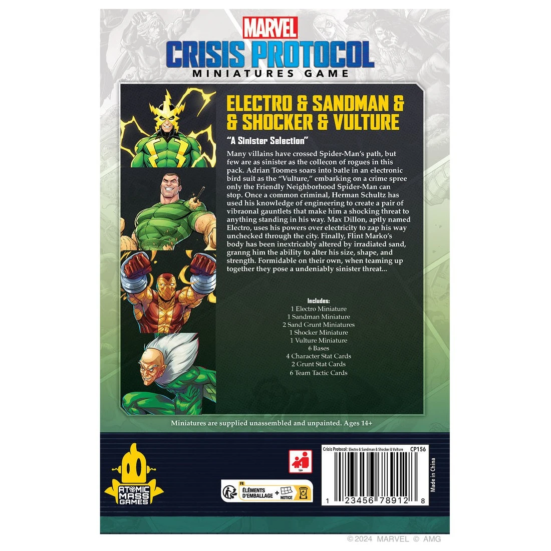 Un groupe de vilains sinistres fait son entrée dans Marvel : Crisis Protocol avec ce pack ! Electro, Sandman, Vulture et Shocker, qui comptent parmi les ennemis les plus célèbres de Spider-Man, offrent aux joueurs encore plus d’options pour constituer leurs escouades de Spider-Foes et du Syndicat criminel.