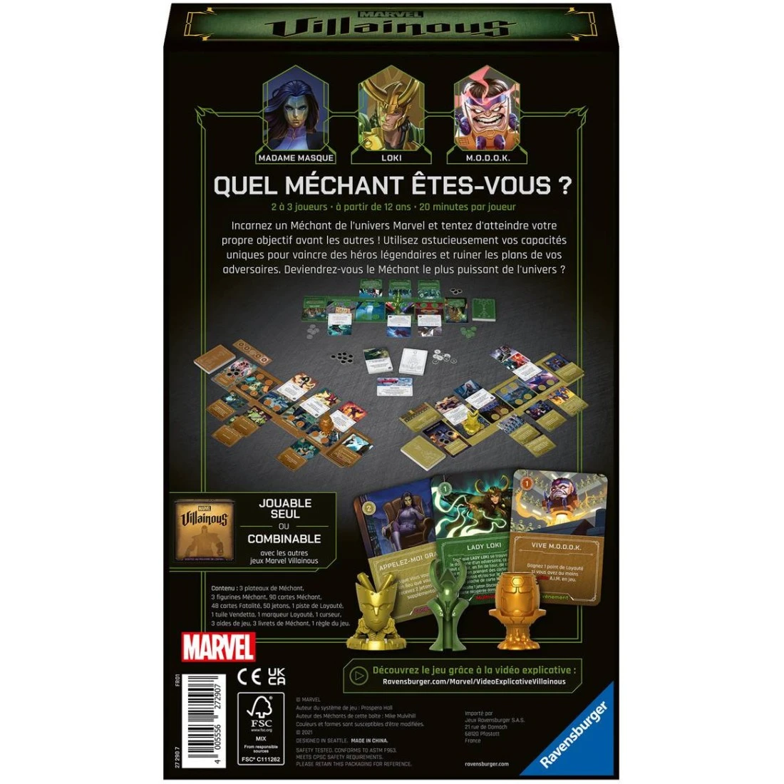 Loki, dieu de la tromperie de l’univers de Thor, M.O.D.O.K, le cobaye à l’intelligence surdéveloppée de l’univers de Captain America ainsi que Madame Masque, une personne formée au combat, arts martiaux et au tir. Incarnez un Méchant iconique de l’univers Marvel ! Exploitez vos compétences de Méchant, saisissez les bonnes occasions et adoptez la bonne stratégie pour dominer la partie. 3 nouveaux personnages, 3 nouveaux objectifs, 3 nouvelles manières de jouer pour devenir le plus grand Méchant Marvel ! Jouable seul ou combiné avec le jeu de base pour des parties jusqu’à 4 joueurs.