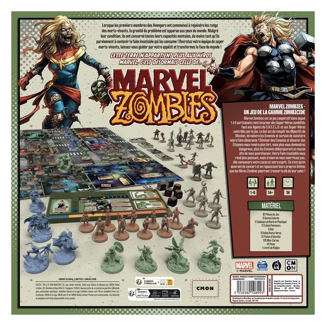 Marvel Zombies place les joueurs dans les corps en décomposition de ces héros souillés. Contrairement aux versions précédentes de Zombicide, ils n’essaient pas d’arrêter les zombies, mais plutôt de répandre la peste partout.
