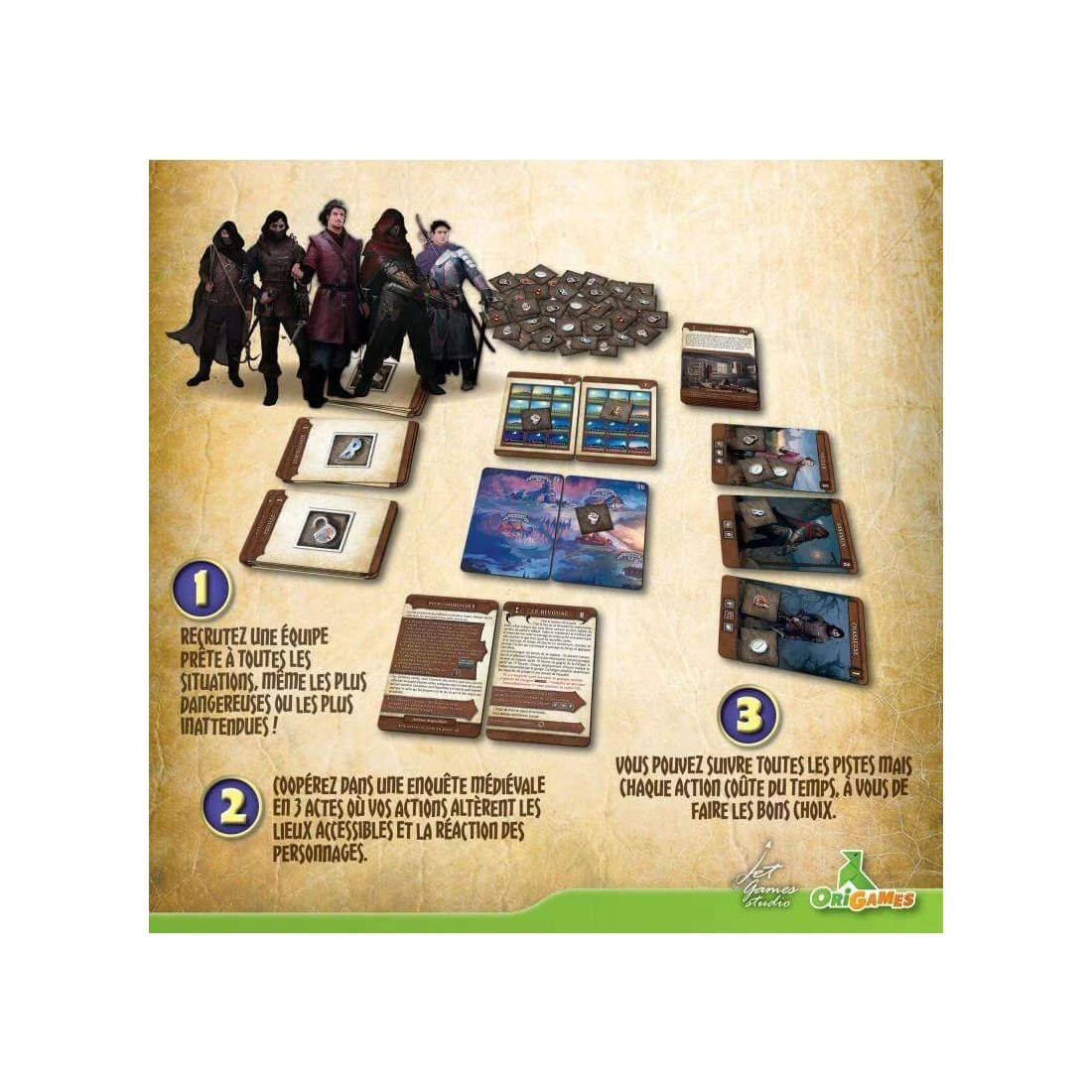 Au cours de trois enquêtes indépendantes, mais liées pour former une campagne, vous allez vivre des aventures étranges et découvrir des secrets bien gardés. Chaque action prend du temps, il faudra aller à l’essentiel tout en découvrant un maximum d’indices. Trois paquets de cartes permettent d’effectuer des actions spéciales : raid, fouille ou surveillance. Vous allez donc mener ces enquêtes à votre façon. Agissez avec prudence et bienvenue dans l’univers de Mortum ! Recrutez une équipe prête à toutes les situations, même les plus dangereuses ou les plus inattendues ! Coopérez dans une enquête médiévale en 3 actes où vos actions altèrent les lieux accessibles et la réaction des personnages. Vous pouvez suivre toutes les pistes mais chaque action coûte du temps, à vous de faire les bons choix.Référence Origames : JDPORI031