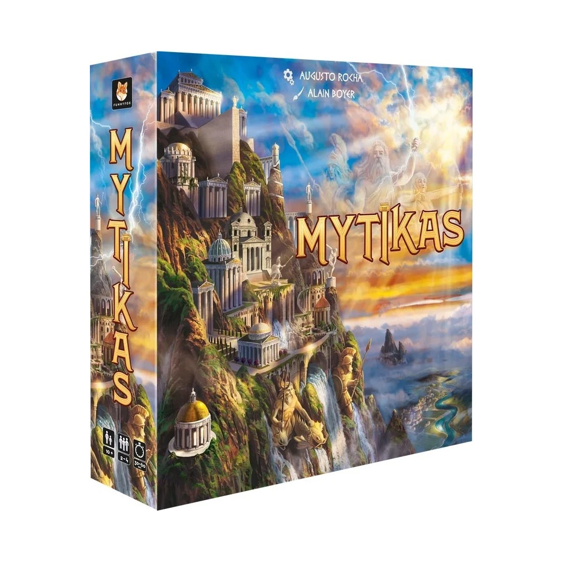 Mytikas est un jeu stratégique de construction et de gestion de ressources sur le thème de la mythologie grecque pour 2 à 4 joueurs à partir de 10 ans et des parties d’environ 45 minutes, édité par Funny Fox.