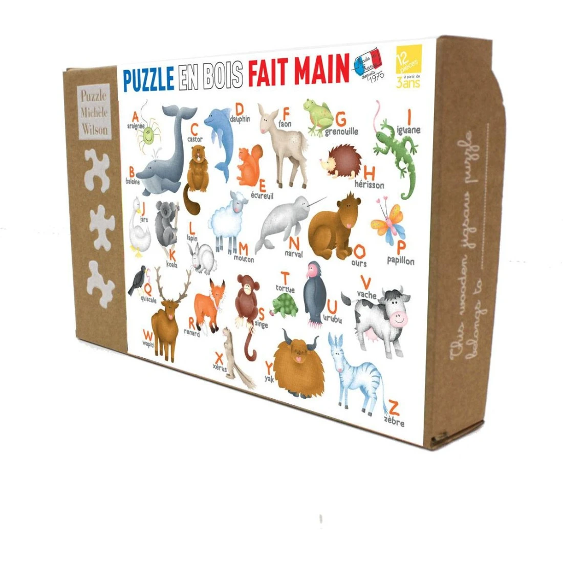 Le Puzzle L’Alphabet des Animaux met en scène des animaux pour apprendre de manière ludique l’alphabet. Chaque lettre de l’alphabet est représentée par un animal, par exemple F pour Faon. Le Puzzle L’Alphabet des Animaux fait partie d’une collection de puzzles en bois (de peuplier issu de forêts Françaises durablement gérées) de 12 pièces de Michèle Wilson.