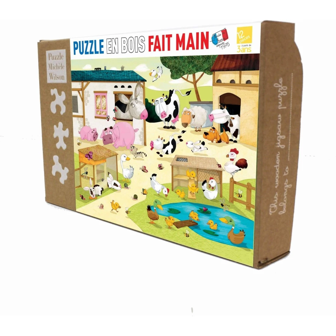 Le Puzzle La Ferme fait partie d’une collection de puzzles en bois (de peuplier issu de forêts Françaises durablement gérées) de 12 pièces de Michèle Wilson. Ludique et éducative, cette collection, spécialement conçue pour les enfants, regroupe de belles images créées par de grands illustrateurs pour la jeunesse. Ces puzzles, découpés à la main et fabriqués en France, incitent l’enfant à commencer par le contour grâce à leurs bords « pédagogiques ». Un vrai challenge pour les petits futés : les pièces sont toutes différentes ! Le tout est emballé dans une belle boîte kraft en carton recyclé qui s’ouvre et se ferme très facilement.
