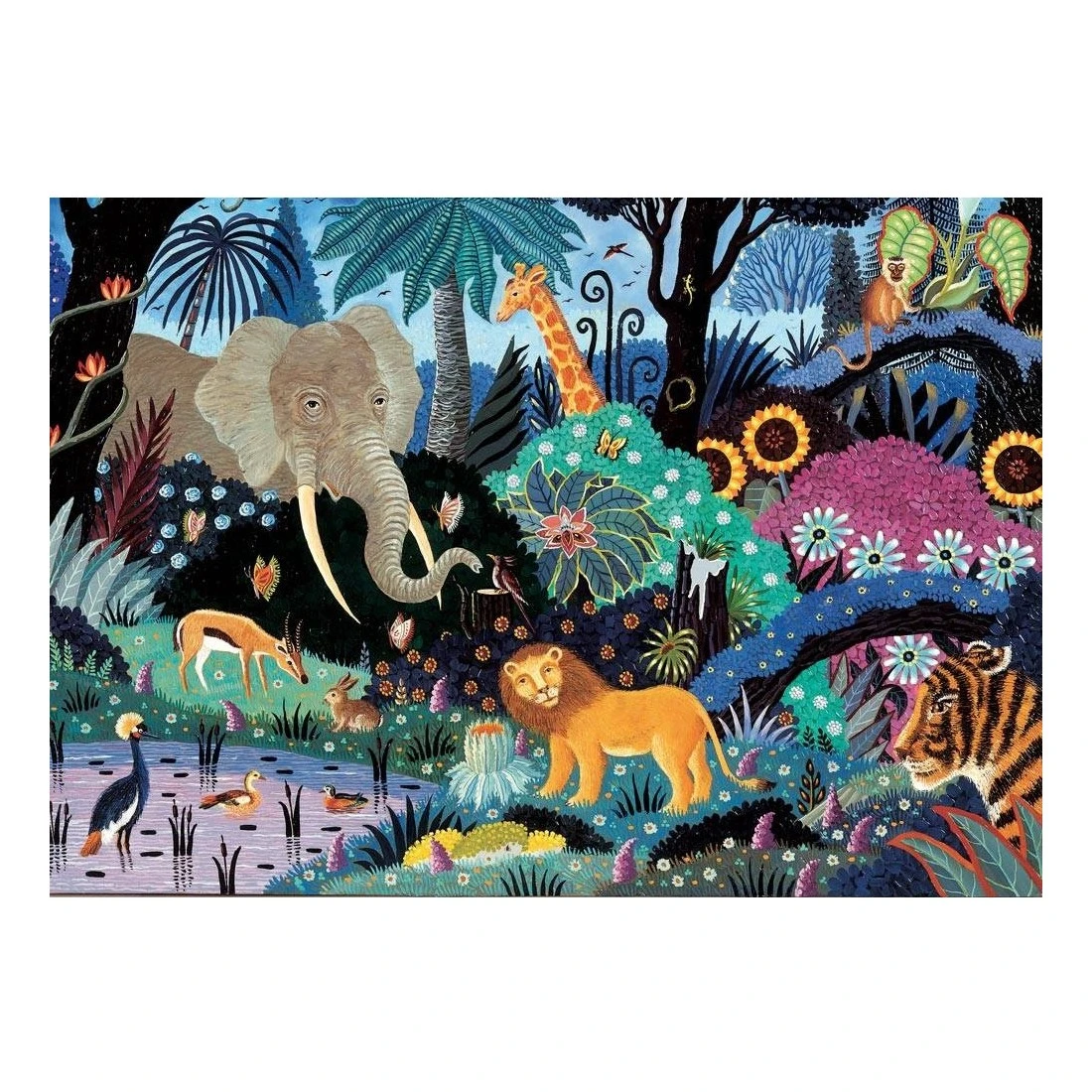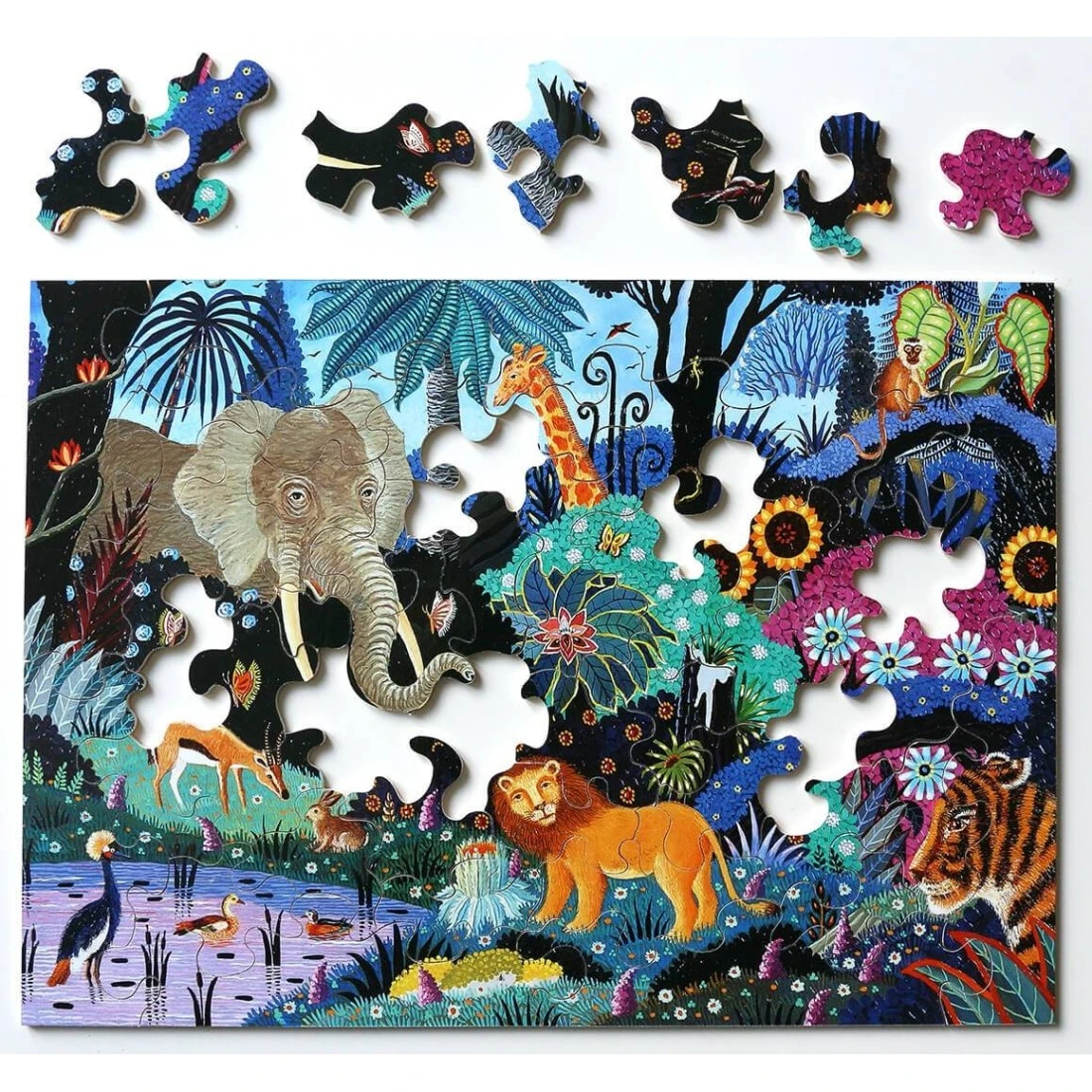Le Puzzle Nuit dans la Jungle fait partie d’une collection de puzzles en bois (de peuplier issu de forêts Françaises durablement gérées) de 50 pièces de Michèle Wilson. Ludique et éducative, cette collection, spécialement conçue pour les enfants, regroupe de belles images créées par de grands illustrateurs pour la jeunesse. Ces puzzles, découpés à la main et fabriqués en France, incitent l’enfant à commencer par le contour grâce à leurs bords « pédagogiques ». Un vrai challenge pour les petits futés : les pièces sont toutes différentes ! Le tout est emballé dans une belle boîte kraft en carton recyclé qui s’ouvre et se ferme très facilement.