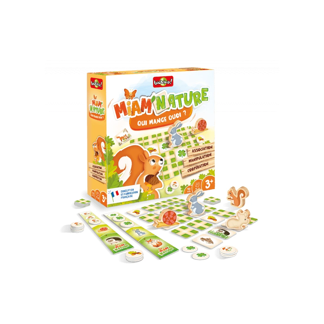 L’escargot, le lapin, la souris et l’écureuil ont faim. Tous ensemble, les joueurs tentent de remplir au moins deux de leurs garde-manger. Pour cela, les joueurs déplacent les animaux de tuile en tuile le long des chemins pour trouver les aliments correspondants à chacune des espèces. Mais gare aux prédateurs qui rôdent et à la nuit qui tombe… Si deux garde-manger sont complets avant la tombée de la nuit, tous les joueurs ont gagné ! La collection « RécréNature » de Bioviva contient 4 jeux d’apprentissages simples et évolutifs (avec deux niveaux de règles) pour accompagner les enfants, dès 3 ans, dans leur découverte du monde vivant. Dans les jeux coopératifs « Miam’Nature », « Tri’Nature », « Pouss’Nature » et « Cach’Nature », tout le monde gagne ou perd ensemble. Une façon ludique et originale pour découvrir ses capacités d’entraide ! Chaque jeu peut également être joué en toute autonomie avec un système d’auto-correction permettant à l’enfant de vérifier ses réponses. La collection a été développée avec des enfants, des parents et des professionnels de la petite enfance. Miam’Nature – Qui Mange Quoi ? c’est aussi faire un choix éco-responsable car :