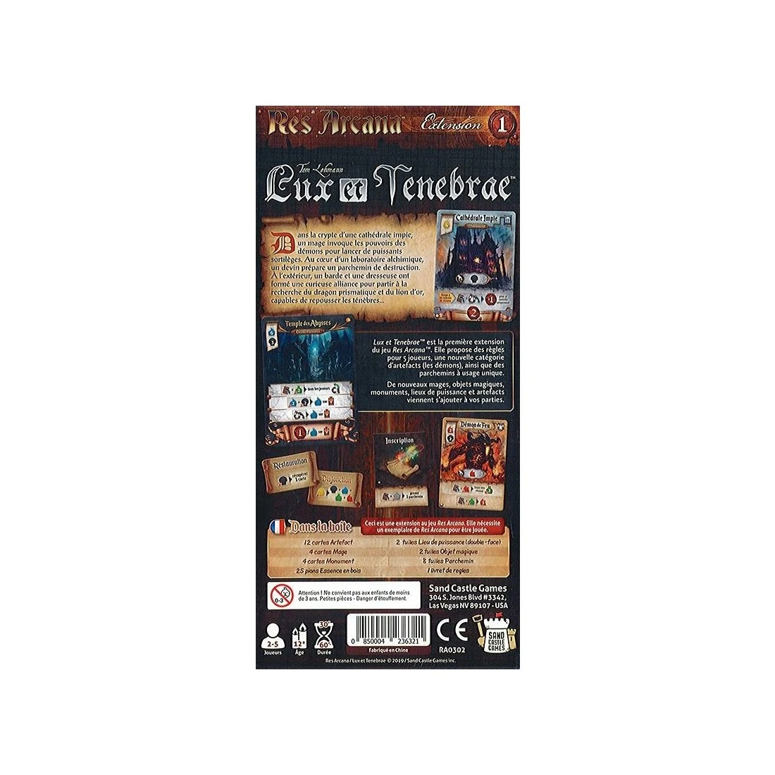Cette extension ajoute 4 nouveaux lieux de pouvoir, 12 artefacts, 4 mages, 4 monuments et 2 objets magiques.Lux Et Tenebrae permet également de jouer jusqu’à cinq joueurs, d’adapter les règles pour les parties 4 joueurs ou moins, et introduit deux nouveaux types d’objet : les parchemins et les Démons.