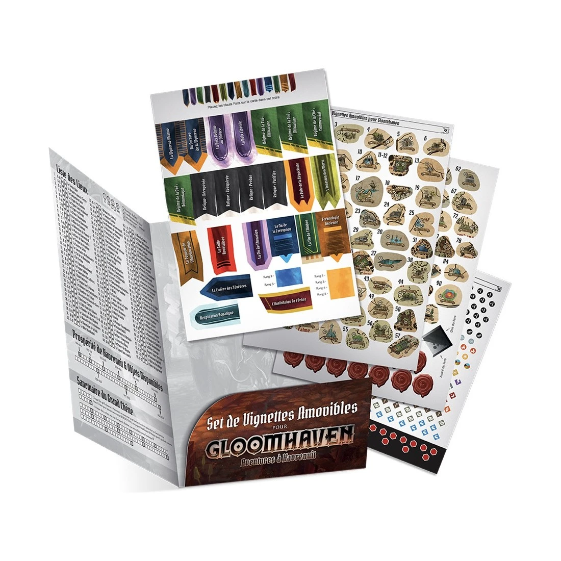 Un ensemble d’autocollants vinyle amovibles compatibles avec la première et la deuxième impression de Gloomhaven. Ce pack contient un remplacement pour chaque carte, réalisation et amélioration dans le jeu de base, et comprend également des sceaux de remplacement pour les boîtes de personnages, les enveloppes secrètes et le livre des archives de la ville.