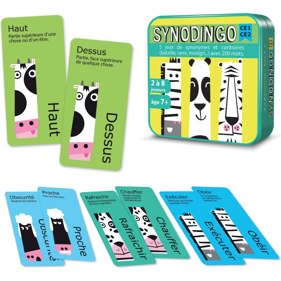 Le jeu SynoDingo est un jeu de cartes rigolo qui fait travailler les notions de synonyme et de contraire (ou antonyme).