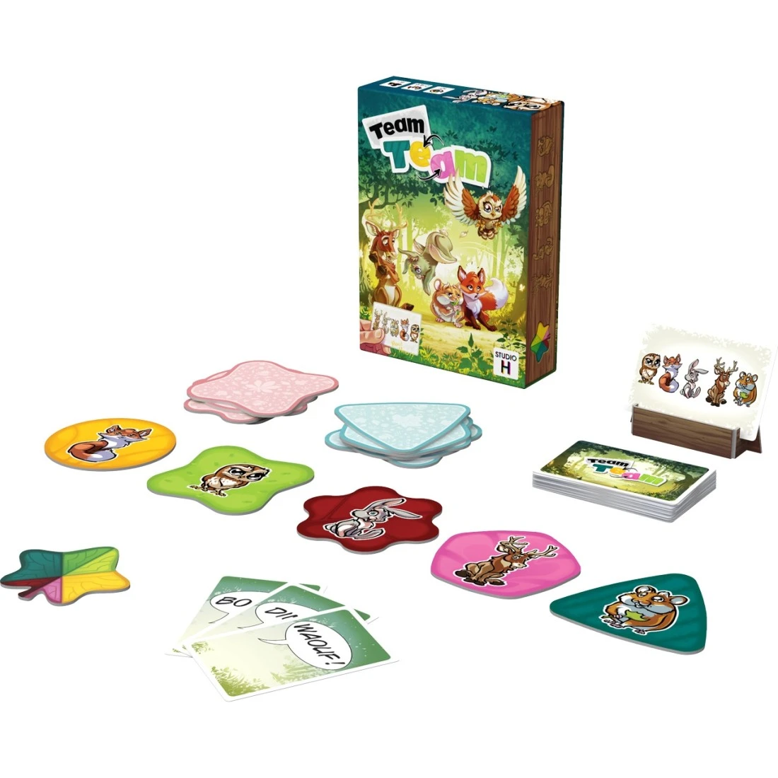 Team Team est un jeu de communication familial et délirant ! Avec votre partenaire, réordonnez les animaux correctement avant les autres équipes. Mais saurez-vous vous comprendre en n’utilisant que le son loufoque imposé pour le tour ?