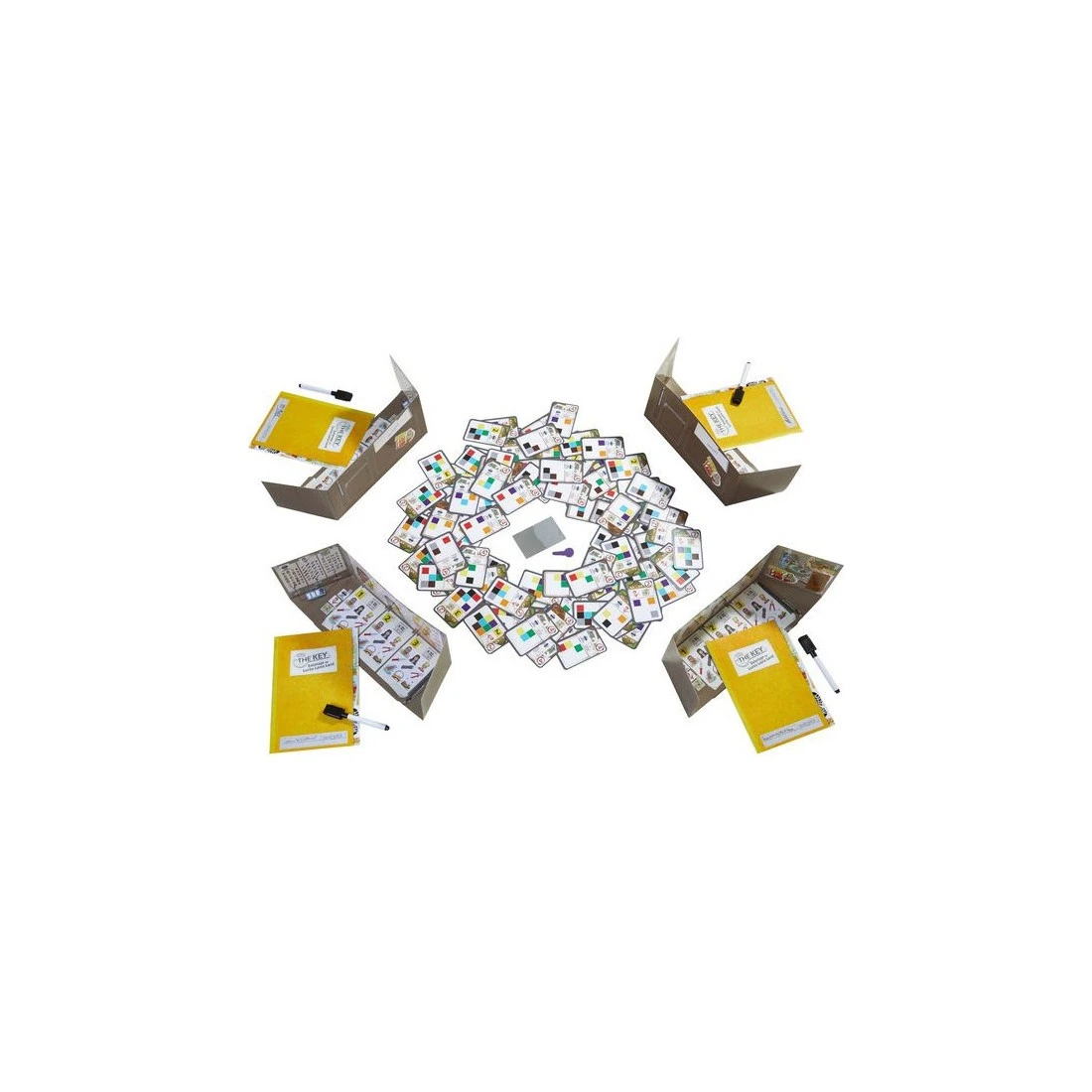 - Chacun prend un porte-documents paravent, un feutre et un dossier d’enquête. Répartissez toutes les cartes faces cachées au milieu de la table. Choisissez une clé et posez-la à côté.