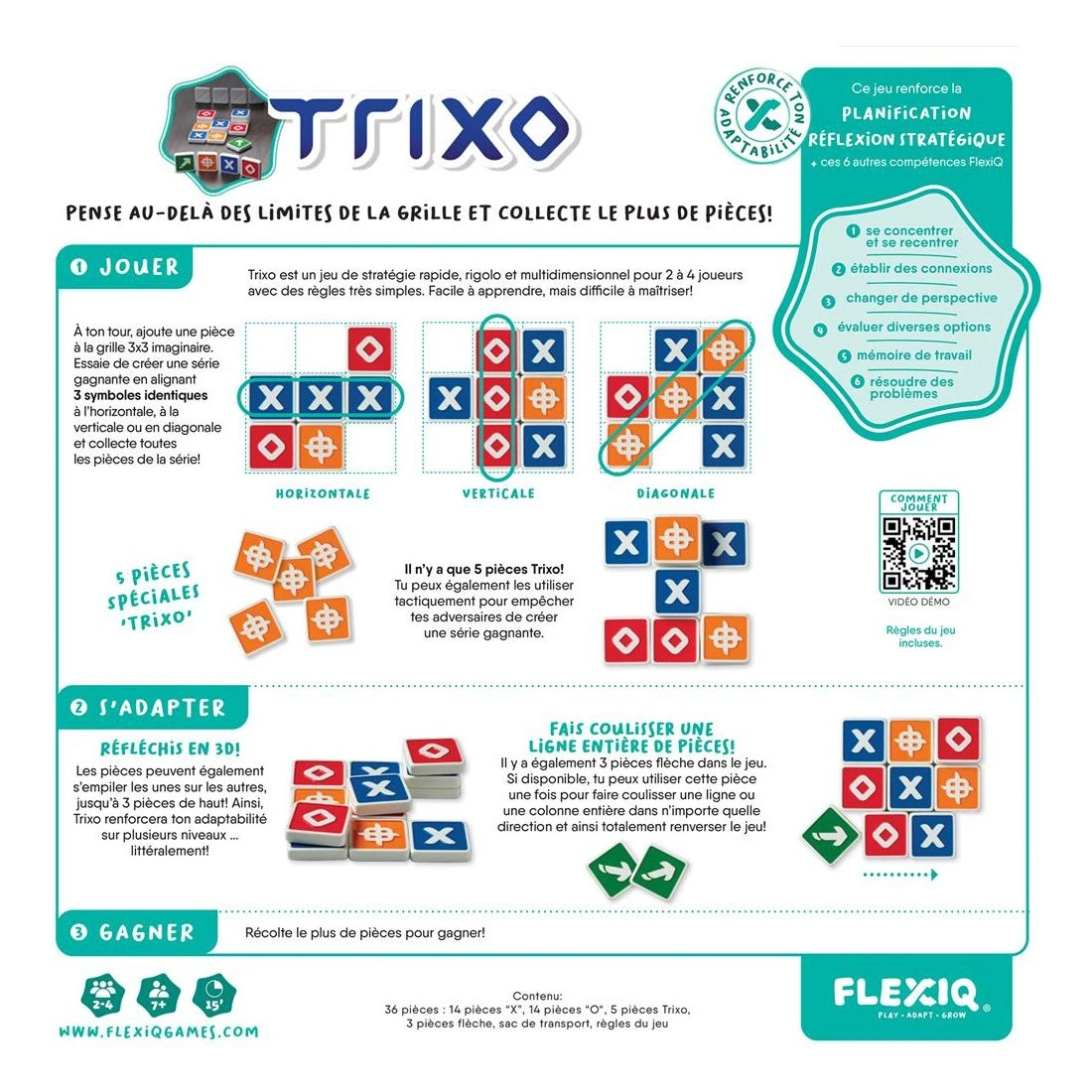 Contenu36 pièces (14 pièces «X», 14 pièces «O», 5 pièces Trixo, 3 pièces flèche), 1 sac, 1 livret de règlesPoints-clés
