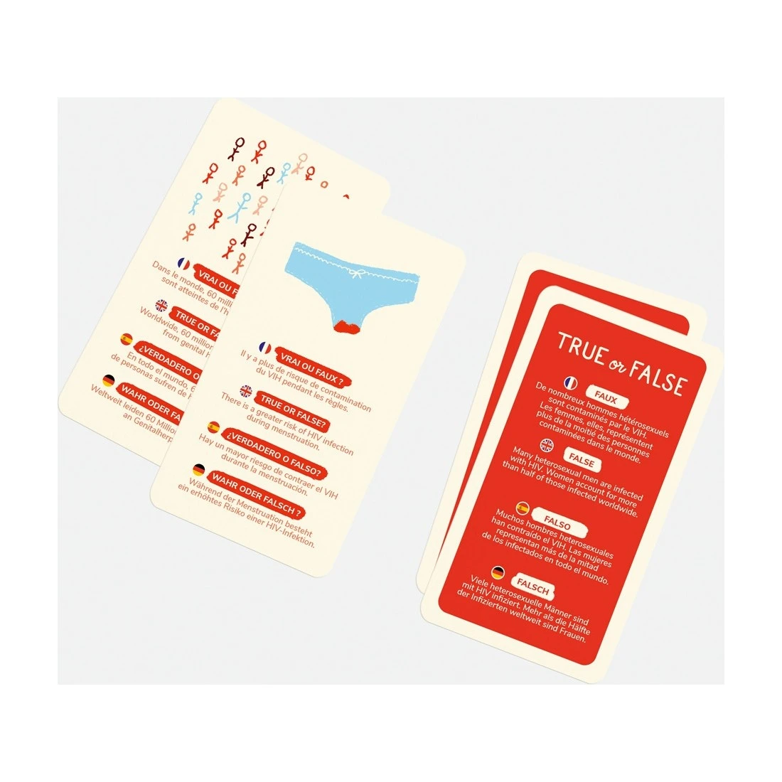 True or False est la nouvelle version internationale de jeu Vrai ou Faux Ist sur les Infections et Maladies sexuellement transmissibles. Sur chaque carte, une illustration originale permettant aux jeunes de s’approprier la question. Les réponses aux questions ont été rédigées par des médecins.