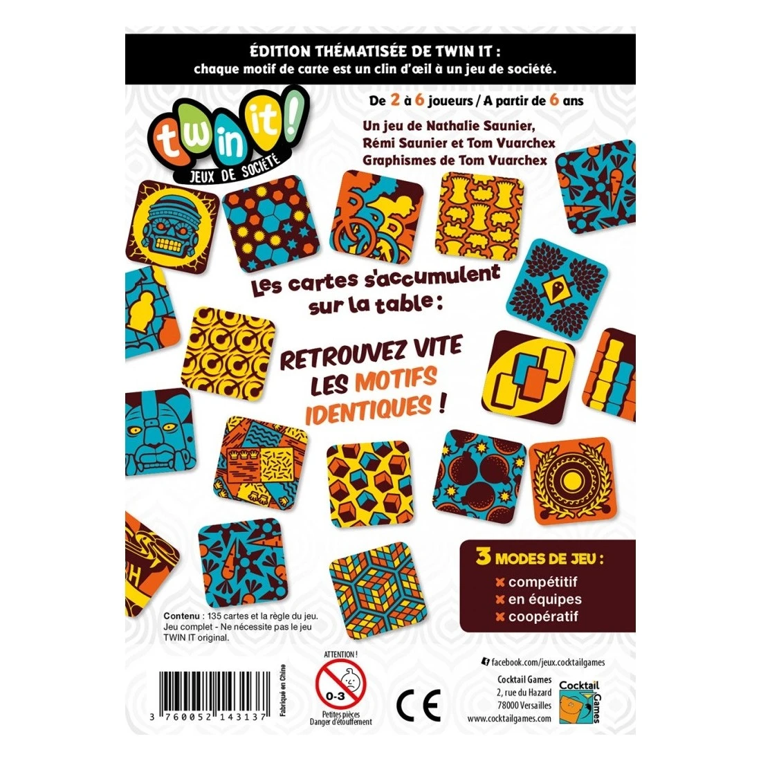 A Twin it, les cartes s’accumulent sur la table en formant une mosaïque colorée. Votre but ? Essayer de détecter plus vite que les adversaires les paires de cartes aux motifs exactement identiques !