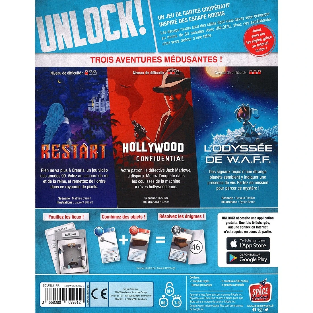 Unlock ! Extraordinary Adventures, un escape room chez vous Unlock! est un jeu de cartes coopératif inspiré des escape rooms. Les escape rooms sont des salles dont vous devez vous échapper en moins de 60 minutes. Unlock! vous fait vivre ces expériences chez vous, autour d’une table. Après avoir pris connaissance du contexte du scénario, vous commencez votre aventure dans une pièce (une carte de lieu qui indique divers numéros). Fouillez-la pour trouver des objets ! Attention : certains peuvent être cachés ! Des énigmes visuelles ou audio ralentissent votre progression… à vous de coopérer avec vos partenaires pour avancer et terminer dans les temps ! Unlock ! Extraordinary Adventures, un jeu interactif L’application gratuite Unlock!, compatible avec les téléphones et tablettes Android et iOS, est nécessaire pour jouer. Elle permet d’obtenir des indices, de repérer des objets cachés, mais aussi d’entrer les codes découverts. Elle contribue également à l’ambiance avec ses musiques dédiées à chaque aventure, ses énigmes audio, ses terribles pénalités et son compte à rebours fatal ! Afin de bien appréhender les règles, la boîte contient une dizaine de cartes servant de tutoriel. Les cartes du tutoriel sont emballées avec les cartes du scénario 1.