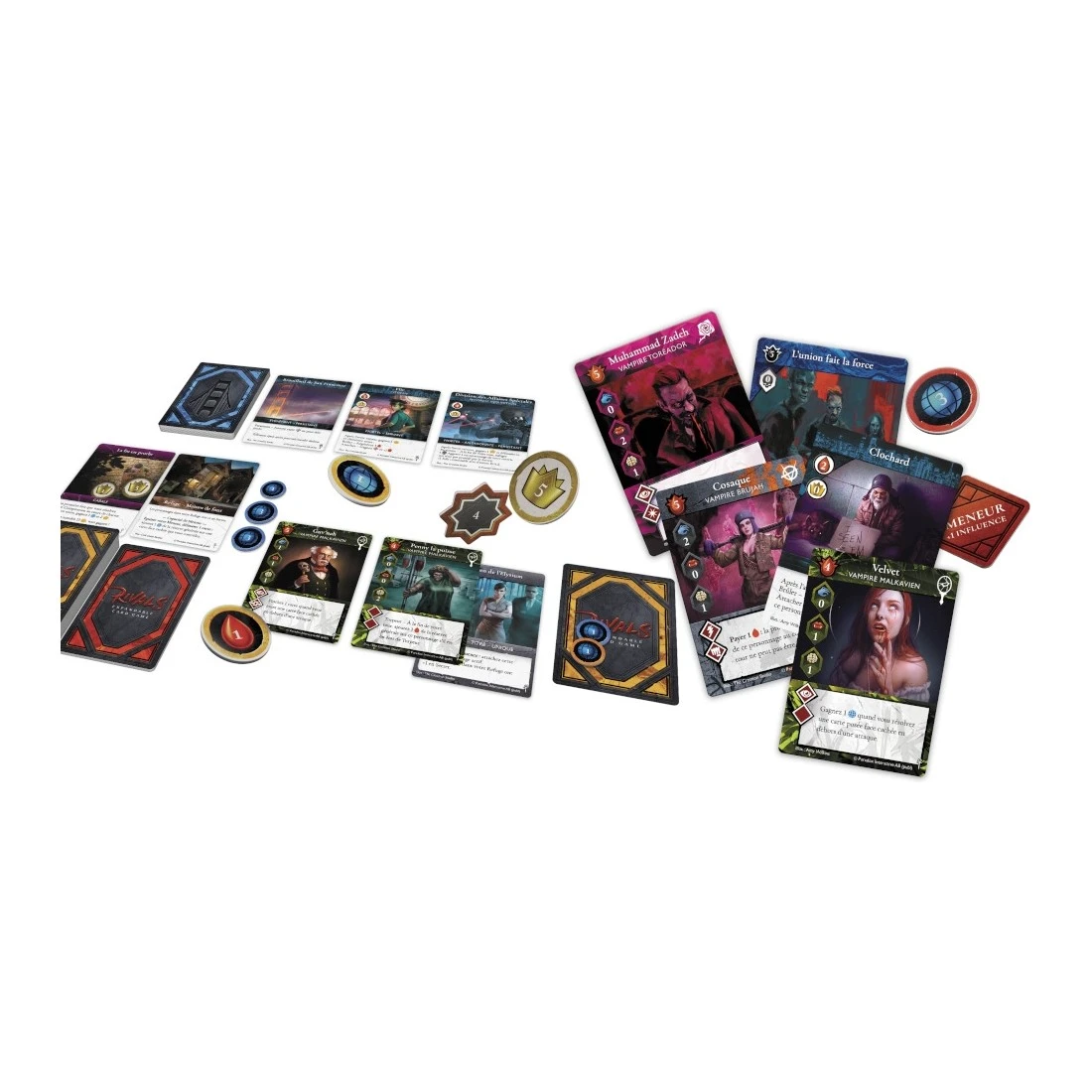 Cette boîte de base inclut quatre decks complets prêts à jouer mettant en avant les clans Toréador, Ventrue, Brujah et Malkavien, tout le nécessaire pour que jusqu’à quatre joueurs se lancent dans leurs propres machinations en vue de la domination.
