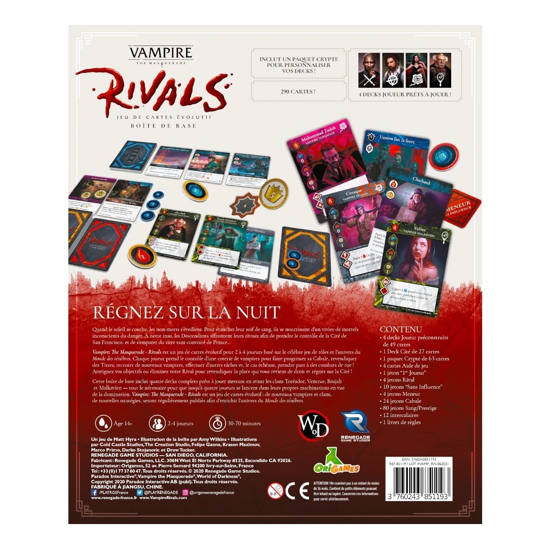 Vampire Rivals est un jeu de cartes évolutif pour 2 à 4 joueurs basé sur le célèbre jeu de rôle et l’univers du Monde des ténèbres.